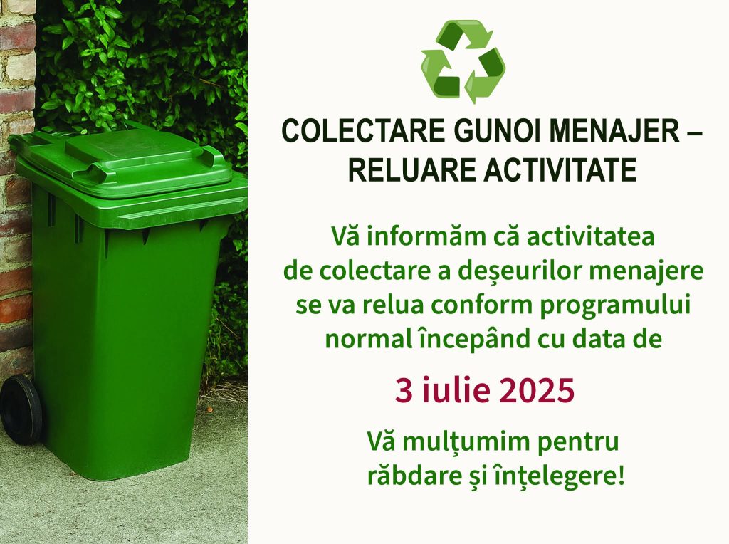 Vă informăm că activitatea de colectare a deșeurilor menajere se va relua conform programului normal începând cu data de 3 iulie 2025.